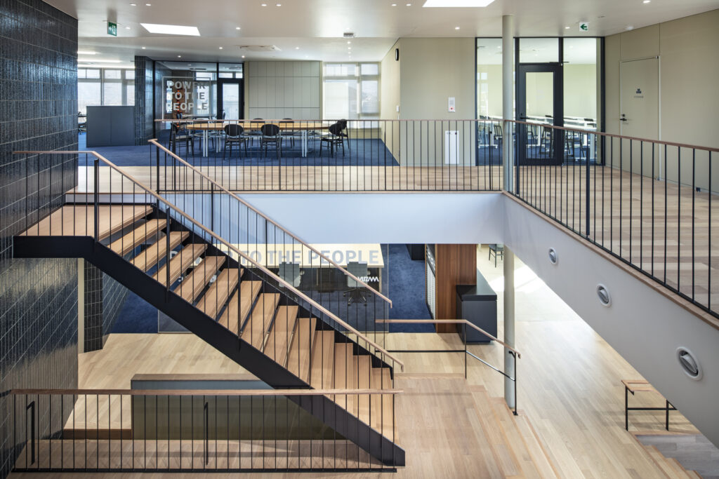 内部の中心となる階段まわりには大きな吹抜けが設けられ、開放的な空間を形成しています。吹抜け周囲の約9mスパンに対しては、梁せいを抑え十分な天井高さを確保するため、直径139.8mmの円形鋼管柱を配置し、RC梁を支持することで、空間の連続性と開放感を確保しています。